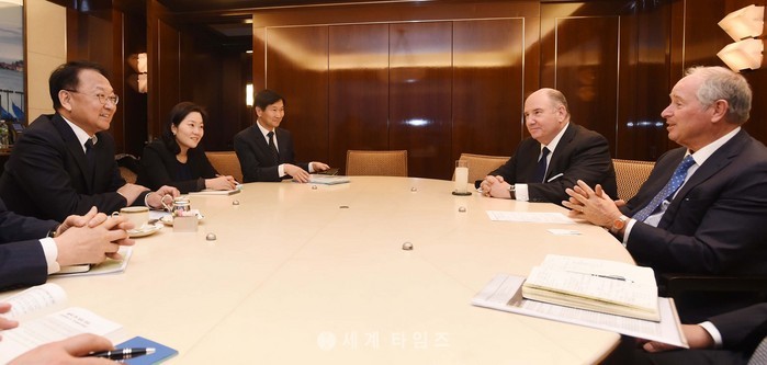 뉴욕 한국경제설명회(IR) 개최로 미국 뉴욕을 방문 중인 유일호 부총리 겸 기획재정부 장관이 10일(현지시간) 블랙스톤 본사를 방문를 방문하여 스티븐 슈워츠만 블랙스톤 회장과 면담을 하고 있다. 2017.01.11. (사진=기획재정부 제공)