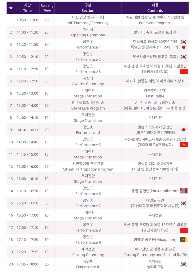 ◈ 올해는 한일 국교 정상화 60주년을 기념한 한일 미래 세대의 듀엣 공연을 비롯해 일본, 베트남, 몽골, 카메룬, 한국 등 다양한 국내외 초청공연은 물론, 부산영어방송(BeFM) 특집 공개방송도 열려 [부산 세계타임즈=이용우 기자] 세계인과 함께하는 글로벌 가족 축제가 부산에서 열린다!