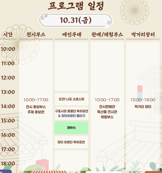 개막식은 오는 10월 31일 오후 3시에 열리며, 구포시장 풍물단의 길놀이와 전라남도 장터유랑단의 줄타기 공연으로 화려한 막을 올린다.
