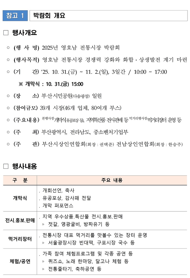 ◈ 박 시장, “영호남을 비롯한 전국의 전통시장이 부산에 모여 지역 특산품의 판로 확대와 매출 증대를 통해 전통시장에 활력을 불어넣는 계기가 될 [부산 세계타임즈=이용우 기자] 부산시(시장 박형준)는 전라남도와 함께 영호남을 비롯한 전국의 대표 전통시장이 한자리에 모이는 「2025년 영호남 전통시장 박람회」를 오는 31일부터 11월 2일까지 3일간 부산시민공원 다솜광장 일원에서 개최한다고 밝혔다.