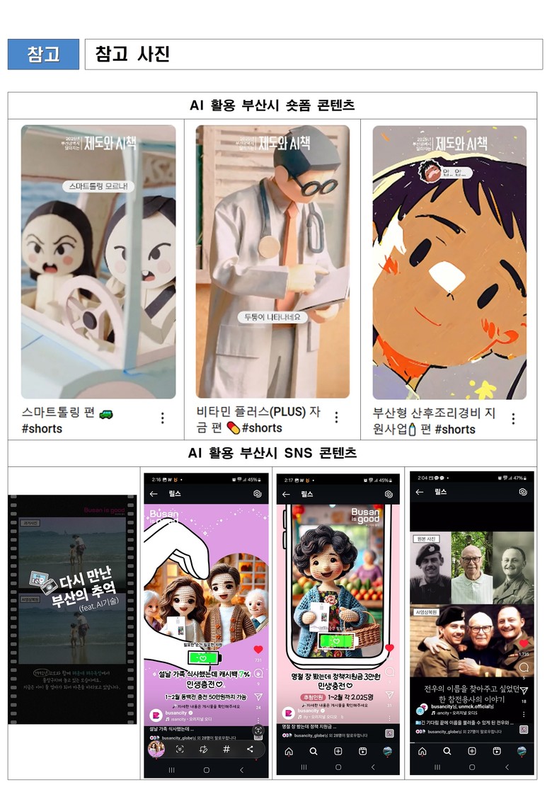 작년 추석 명절 기간에는 ‘다시 만난 부산의 추억’이란 제목으로 부산에서의 추억이 담긴 사진을 공모받아 인공지능(AI) 콘텐츠로 제작해 시민들에게 추억을 선물했다. ‘턴 투워드 부산’이 있는 11월에는, 재한유엔기념공원과 공동으로 한국전쟁에 참전했던 전우들이 인공지능(AI)을 통해 다시 만나는 모습을 연출해 감동을 선사했다. 해당 콘텐츠는 시 공식 해외 인스타그램(@busancity_globe)에서 132만 뷰를 달성했다.