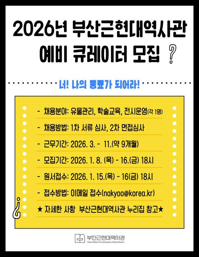 ◈ 서류심사 후 면접전형 실시, 선발자 대상 3월부터 11월까지 9개월간 학예 실무 중심 현장 교육·실습 운영 [부산 세계타임즈=이용우 기자] 부산근현대역사관은 박물관 학예 분야 전문인력 양성과 청년 일자리 창출을 위해 오늘(8일)부터 1월 16일까지 「2026년 부산근현대역사관 예비 큐레이터(기간제근로자)」를 공개 모집한다고 밝혔다.