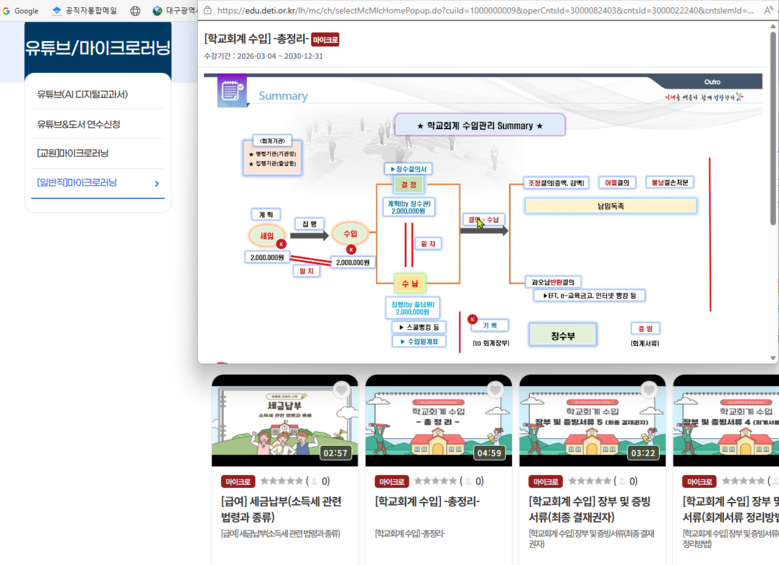 연수 과정은 ▲공무원 급여·수당 ▲교육공무직원 급여·각종수당·연차유급휴가·퇴직금 ▲ 4대보험 ▲ 연말정산 ▲학교회계 수입 등 급여 및 세입 업무와 관련된 총 129개 세부 강좌로 구성되어 있으며, 각 강좌는 1~13분 내외의 콘텐츠로 제작되어 있고 PC와 모바일을 통해 반복 수강이 가능하다.