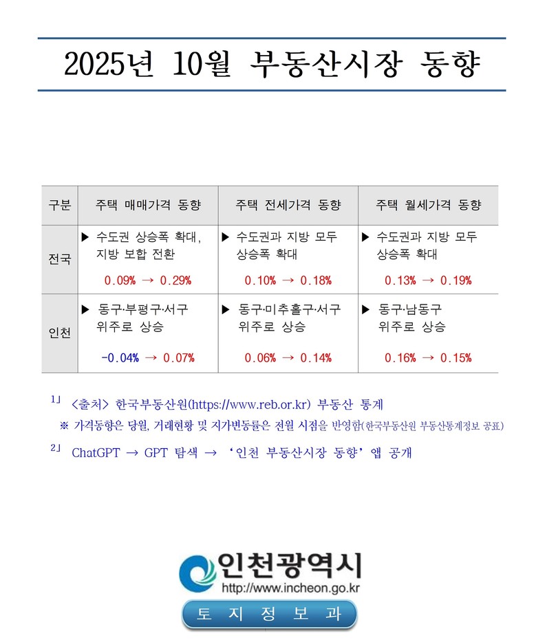 - 대출 규제 등 영향으로 전‧월세 상승 - [인천 세계타임즈=심하린 기자] 인천광역시(시장 유정복)는 인천 지역의 2025년 10월 주택 매매가격이 1년 만에 하락에서 상승으로 전환됐고, 전‧월세가격은 오름세를 보였다고 밝혔다.