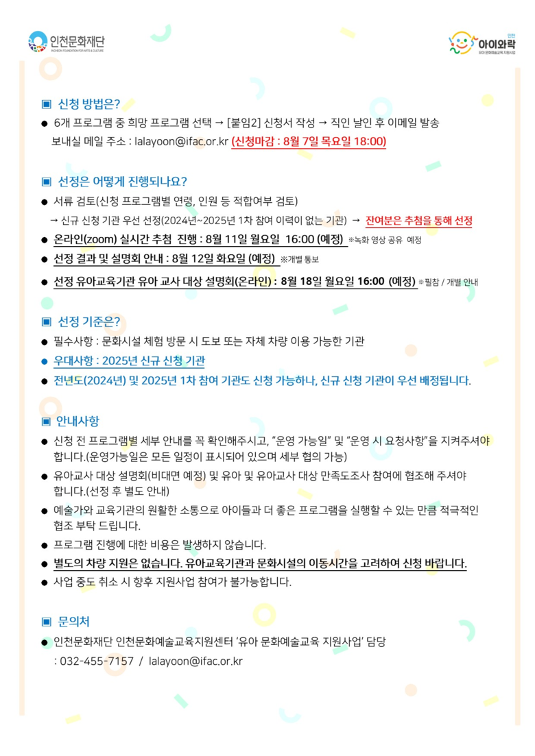 참여를 희망하는 유아교육기관은 인천문화재단 홈페이지(www.ifac.or.kr) 공지사항에서 프로그램별 상세 내용과 운영 일정을 확인할 수 있으며. 신청서 양식을 내려받아 작성한 뒤 이메일로 제출하면 된다. 기관당 최대 2개 반까지 신청 가능하며 모든 프로그램은 전액 무료로 진행된다.