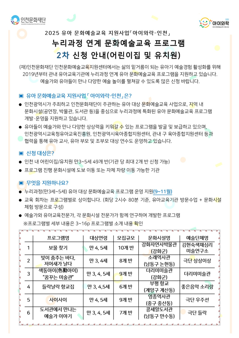 올해 5월 1차 모집에 이어 진행되는 이번 2차 모집에서는 총 6개 프로그램이 인천 전역에서 진행된다. 김현숙색채심리미술연구소(협력 : 강화자연사박물관)의 <보물찾기>, 극단 상상이상(협력 : 소래역사관)의 <빛이 춤추는 바다, 저어새가 날다>, 더리미미술관의 <색동아이 “꿈꾸는 미술관”>, 좋은음악 소리랑(협력 : 부평 향교)의 <들락날락 향교집>, 극단 우주선(협력 : 영종역사관)의 <사이사이>, 극단 들락(협력 : 콩세알도서관)의 <도서관에서 만나는 예술가 이야기>로 구성되며, 총 49개 반을 선정해 2025년 9월부터 11월까지 3개월간 운영할 예정이다.