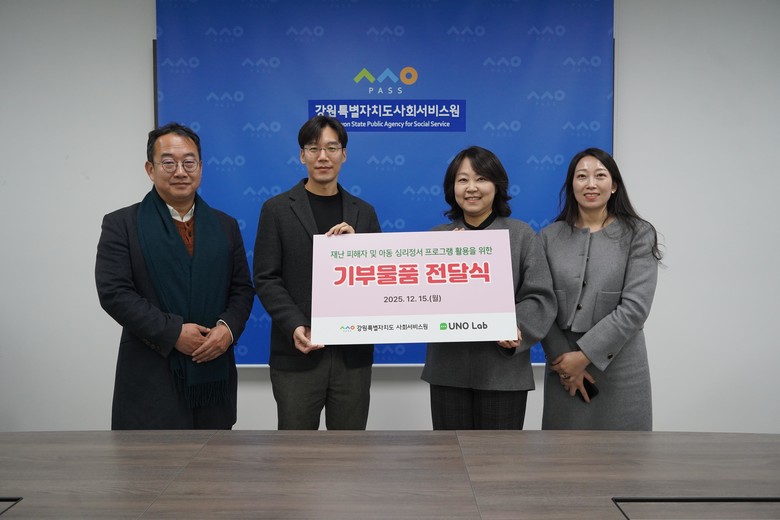 [강원도 세계타임즈=김민석 기자] 강원특별자치도 사회서비스원(원장 이은영, 이하 도 사회서비스원)은 12월 15일(월) (주)유노랩(대표 이윤호)과 함께 아동 심리안정 지원을 위한 기부물품 전달식을 진행했다.