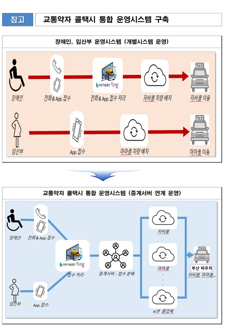 ◈ 이를 통해 교통약자 배차 성공률을 높이고 배차 미수락에 따른 지연 운행을 방지해 시민 불편 해소할 것으로 기대 [부산 세계타임즈=이용우 기자] 부산시(시장 박형준)는 오는 4월부터 '장애인 콜택시'와 '임산부 콜택시'의 운영시스템과 협약 구조를 통합·개편한 '교통약자 콜택시 통합 운영시스템'을 시범 운영한다고 밝혔다.