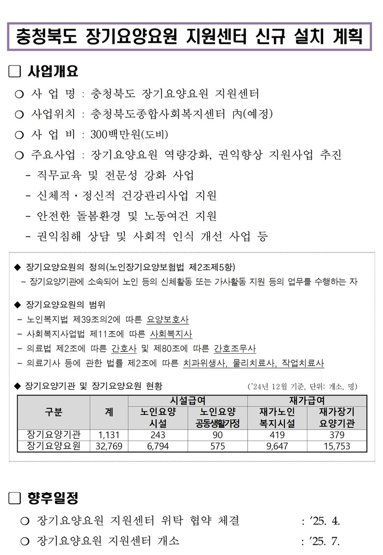 장기요양요원 지원센터는 충청북도 장기요양요원 처우개선조례에 따라 설치되는 센터로, 장기요양기관에서 근무하는 장기요양요원에 대한 건강관리 사업 및 전문성 강화를 위한 교육 등을 지원해 안전한 어르신 돌봄 환경을 제공할 예정이다.