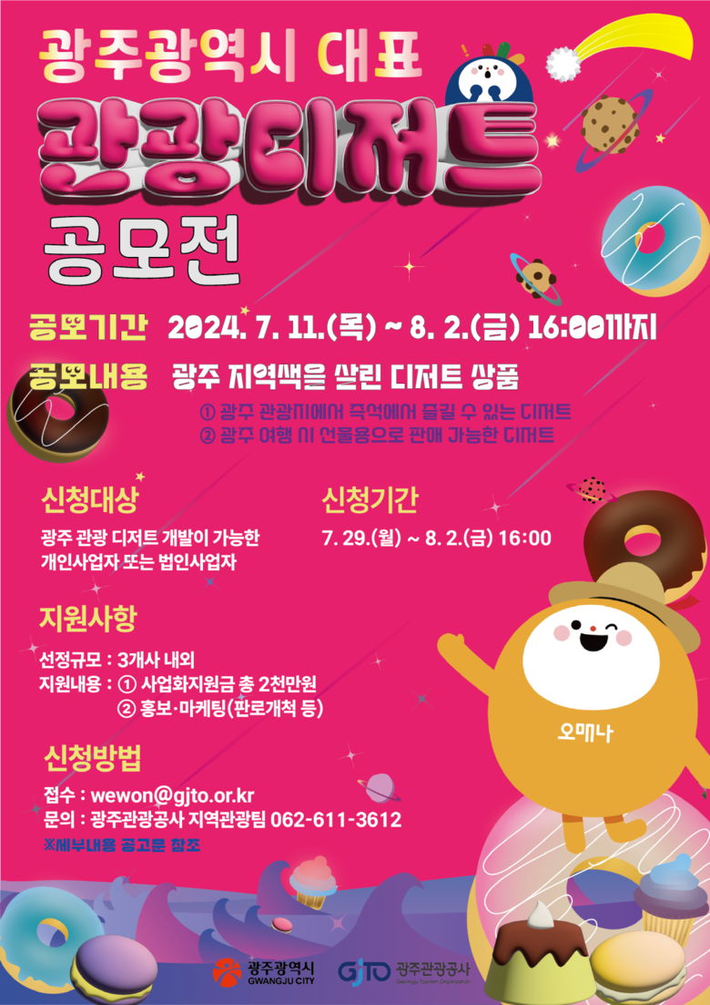 광주광역시(시장 강기정)는 광주관광공사와 함께 맛의 도시 광주를 대표하는 길거리 음식, 음료, 선물용 간식 등 개발을 위한 ‘광주 대표 관광디저트 개발 사업자’를 오는 8월 2일까지 공모한다.