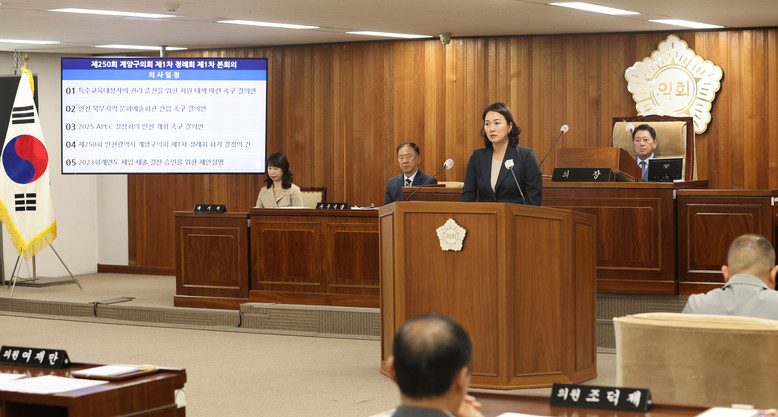 [계양구 세계타임즈=심하린 기자] 인천 계양구의회(조양희 의장)는 지난 3일 제250회 정례회 1차 본회의에서 신지수 의원이 대표 발의한 “2025 APEC 정상회의 인천 개최 촉구 결의안”을 의원 만장일치로 채택했다.