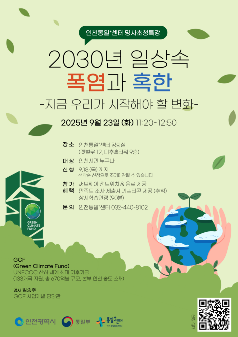 유준호 시 정책기획관은 “이번 특강이 인천 시민들이 기후위기에 대한 인식을 전환하고, 기후행동에 적극적으로 동참하는 출발점이 되길 바란다”며 “앞으로도 인천통일플러스센터를 통해 시민들과 더 가까이 소통하고 공감할 수 있는 다양한 프로그램을 이어갈 것”이라고 말했다.