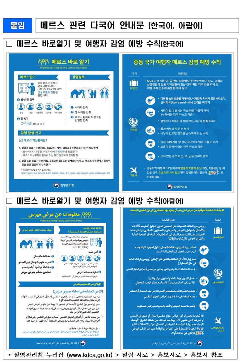 울산시 관계자는 “중동지역 방문자는 귀국 후 2주 이내 증상이 발생하면, 의료기관을 직접 방문하지 마시고 질병관리청 콜센터(1339) 또는 보건소로 즉각 연락해 주시길 당부드린다”라고 말했다.
