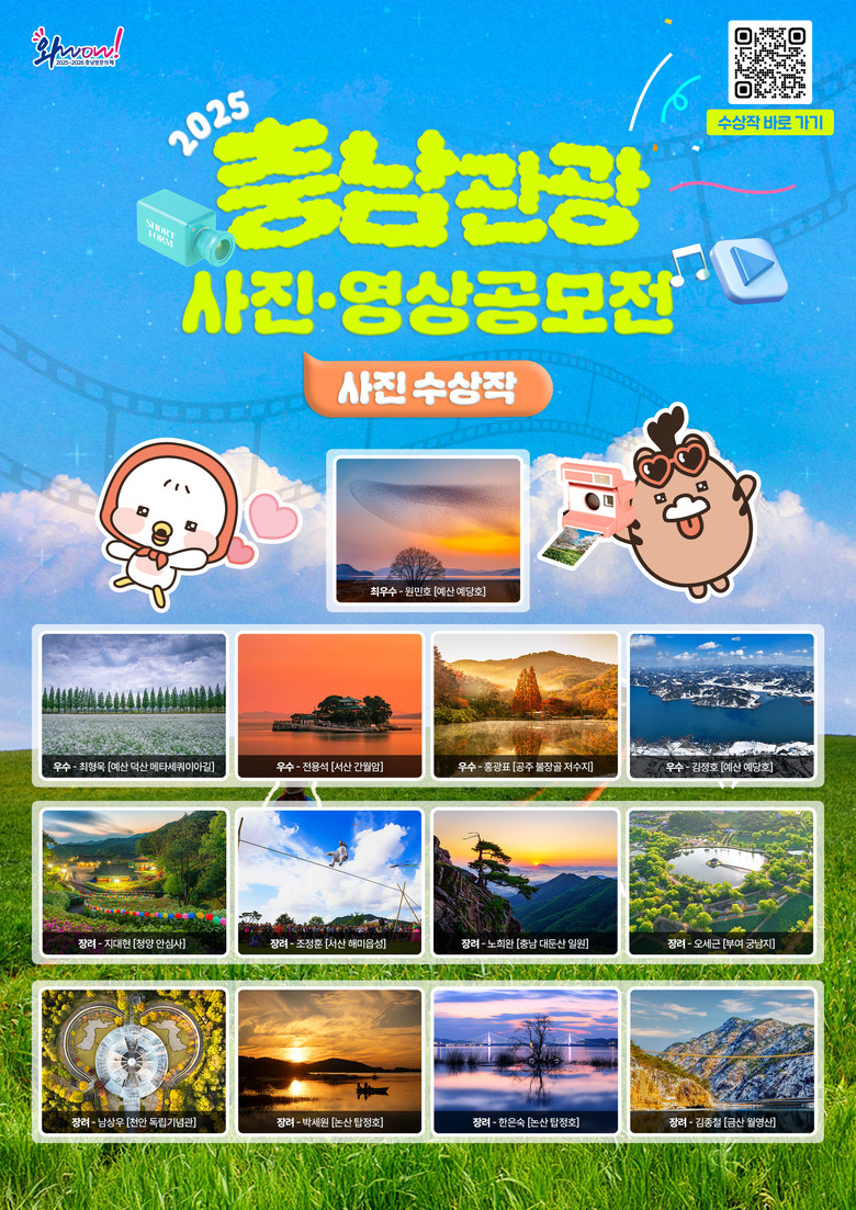 작품들은 각각 최우수상부터 입선작까지 공모전의 영예로운 수상작으로 도내 풍경과 문화, 관광 명소를 독창적이고 감각적으로 표현하고 있으며, 최우수로 선정된 작품은 예산 예당호의 가창오리 군무를 고래처럼 보이도록 연출해 현장감을 생생하게 전달했다.