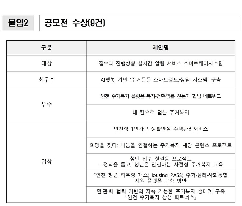 인천시는 이번에 선정된 9건의 수상작을 2026년 주거복지 정책에 반영할 수 있도록 관련 부서와 협력하여 정책화와 실현 방안 마련에 나설 계획이다.