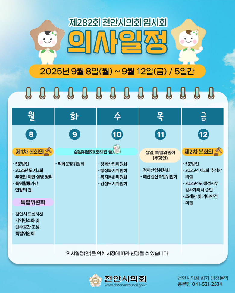 각 상임위원회에서는 ▲천안시 초등학생 학부모 근로자 출퇴근 시간 단축 기업 지원에 관한 조례안 ▲천안시 저소득층 치과 의료비 지원 조례 일부개정조례안 ▲천안시 주거복지 지원 조례 일부개정조례안 ▲광덕 삼안선 도로개설(농도302, 만복-노루목) 청원의 건 등의 안건을 심사한다.