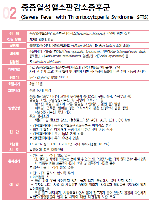 중증열성혈소판감소증후군(SFTS)은 바이러스를 보유한 참진드기에 물려 전파되는 감염병으로, 감염 후 2주 이내에 38℃ 이상의 고열, 오심, 구토, 설사, 식욕부진 등의 증상이 나타난다. 심한 경우 장기 부전으로 악화될 수 있으며, 최근 3년간 누적 사망률은 약 18.5%에 달하는 치명률 높은 질환이다.