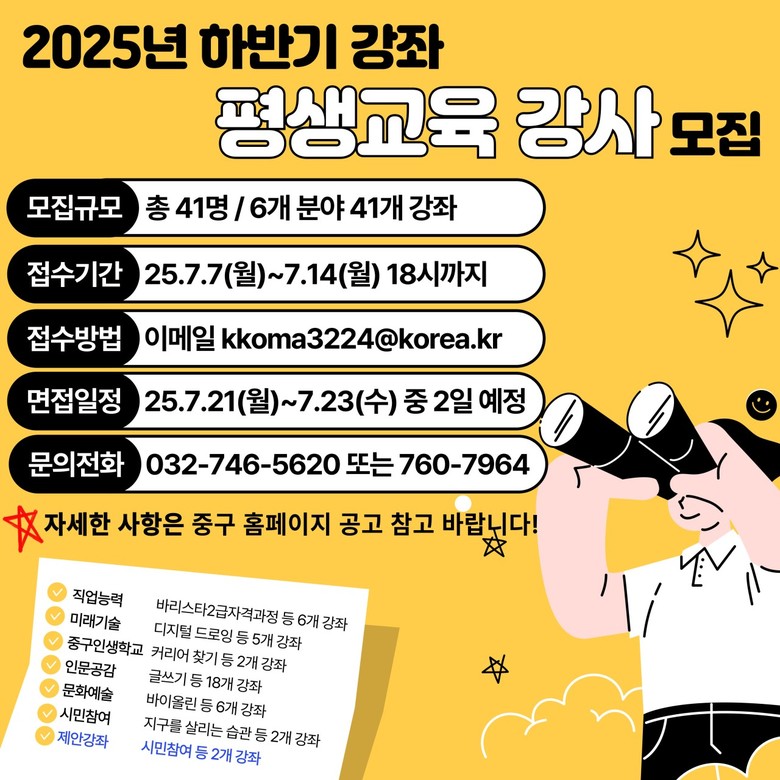중구에서는 “다양한 분야에서 전문성과 열정을 갖춘 강사들의 많은 지원을 기대한다”라며 “앞으로도 주민 삶의 질을 높이고, 지역사회에 이바지할 수 있는 배움의 장을 더욱 풍성하게 만들어가겠다”라고 말했다.