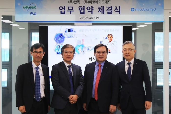 | ▲ 한독과 미코바이오메드가 4월 11일 판교에서 콜레스테롤 측정기 국내 사업 총판에 대한 파트너십 계약을 체결했다. (왼쪽부터) 미코바이오메드 김성우 대표이사, 미코그룹 전선규 회장, 한독 김영진 회장, 한독 Medical Device & Life Science 사업부문 김현익 부사장 |