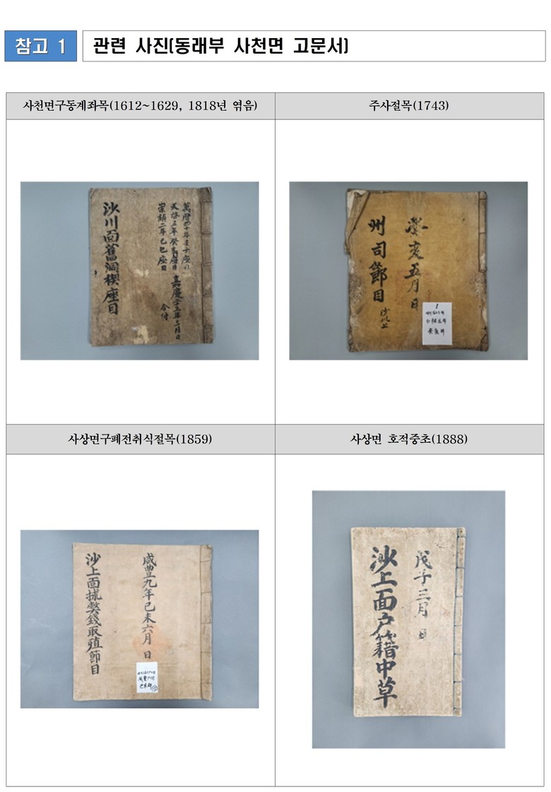 『동래부 사천면 고문서(東萊府 沙川面 古文書)』는 조선시대부터 근대, 현대까지 동래부 사천면의 지역공동체, 지역사회의 재정 운영, 지방 행정을 구체적으로 보여주는 문서이다.