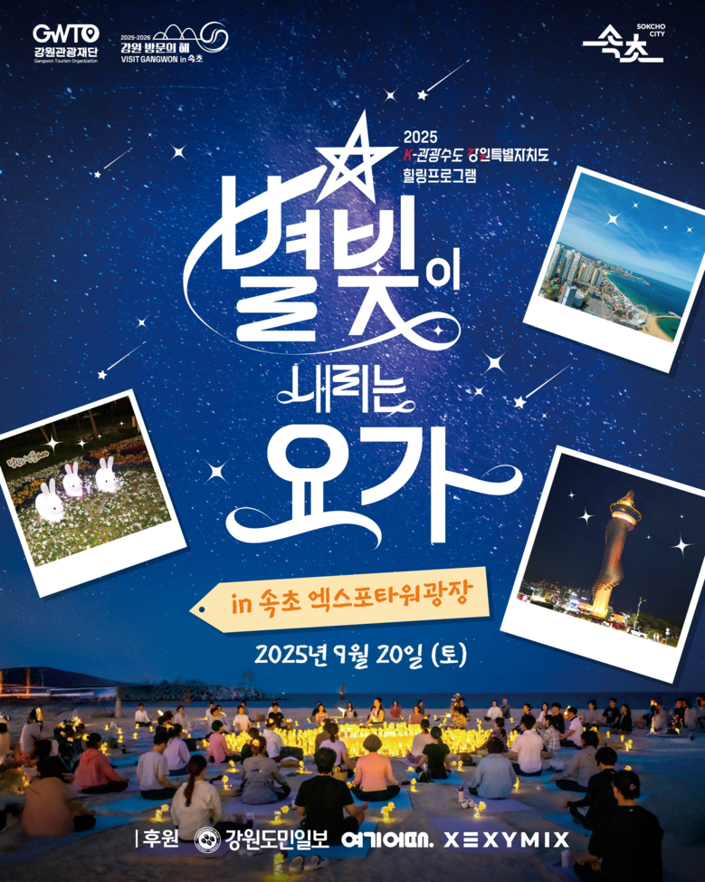 ‘별빛 요가’행사는 별빛 아래 자연과 하나 되는 요가 프로그램으로 몸과 마음의 힐링은 물론, 속초의 매력을 체험할 수 있는 특별한 기회를 제공하기 위해 마련되었다. ‘별빛 요가’는 해가 지고 어둠이 깔린 자연 속에서 전문 요가강사의 지도 아래 진행되는 이색적인 야외 요가 프로그램으로 요가가 끝난 뒤에는 별을 보며 누워서 잔잔한 음악과 함께 호흡과 명상을 하며 긴장을 완화하고 내면의 평화를 회복할 수 있다.