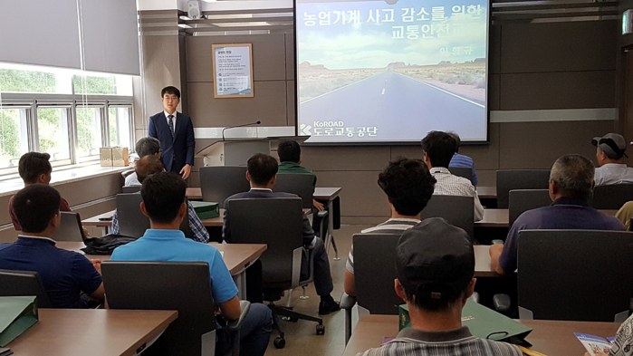 | ▲2017년 8월 31일 농촌진흥청과 도로교통공단 업무협약 시 도로교통공단 대전·충남지부 이형규 교수가 농업인 대상 교통안전 교육을 진행하고 있다. |