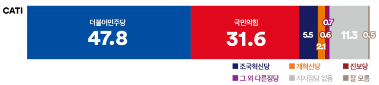 이념 성향별로 보면, 진보층, 중도층은 ‘더불어민주당’이, 보수층에서는 ‘국민의힘’이 우세했다. 중도층에서 ‘더불어민주당’이 1.7%p 상승한 52.3%를 기록했으며, ‘국민의힘’은 1.2%p 오른 24.3%를 기록해 양당 간 격차는 28.0%p로 벌어졌다.