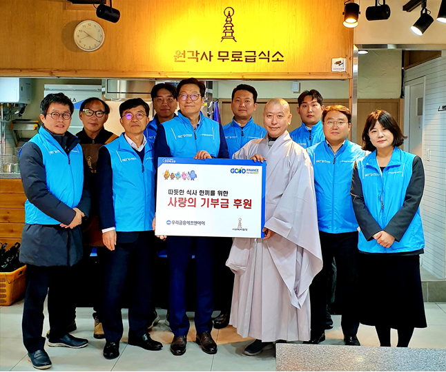 이번 후원금은 지역사회 취약계층을 위한 무료급식 운영에 사용될 예정이다. 후원금 전달식과 배식 봉사에 원각사 무료급식소 대표인 원경 스님, 우리금융에프앤아이 임직원들 을 비롯한 자원봉사자들이 함께했다.