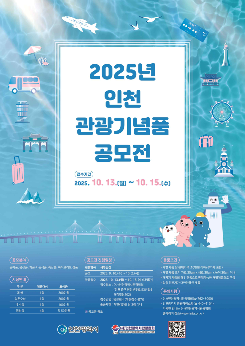 - 10월 13~15일까지 작품 접수, 총 7점 선정, 총상금 800만 원 - 인천 [세계타임즈=심하린 기자] 인천광역시(시장 유정복)는 인천을 찾는 국내외 관광객들에게 오래도록 기억에 남을 특별한 추억을 선사할 수 있도록, 인천만의 고유한 특성을 담은 실용적인 관광기념품을 발굴하기 위해 ‘2025년 인천 관광기념품 공모전’을 개최한다고 밝혔다.