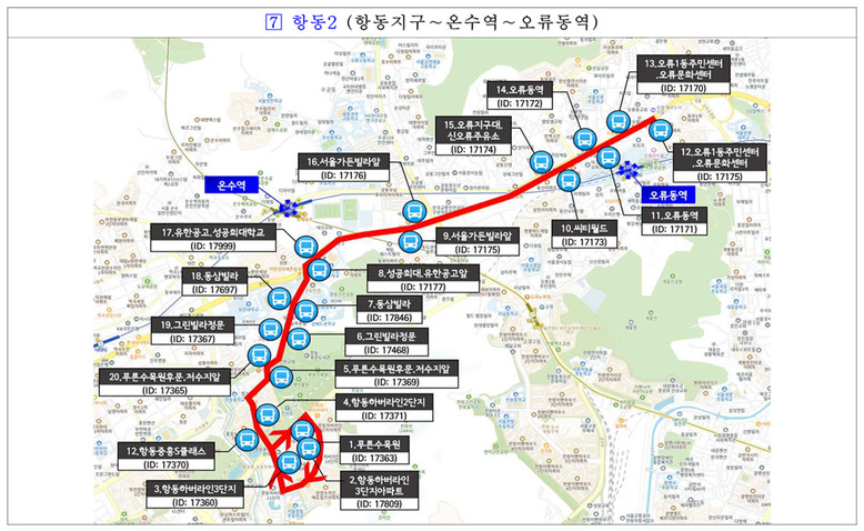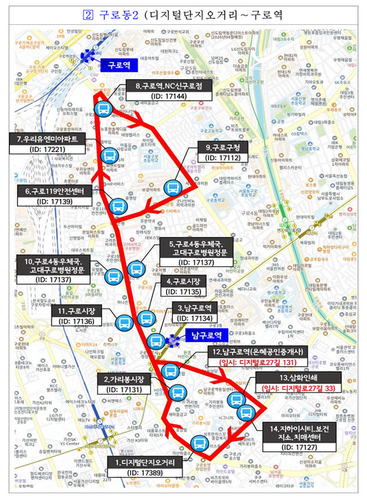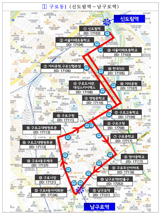 운행 노선은 △구로동1(신도림역∼남구로역) △구로동2(디지털단지오거리∼구로역) △고척동1(고척사거리∼오류동역) △항동1(항동지구∼천왕역) △구로동3(디지털단지오거리∼구로디지털단지역) △수궁동1(궁동생태공원∼온수역) △항동2(항동지구∼온수역∼오류동역) 등이다.