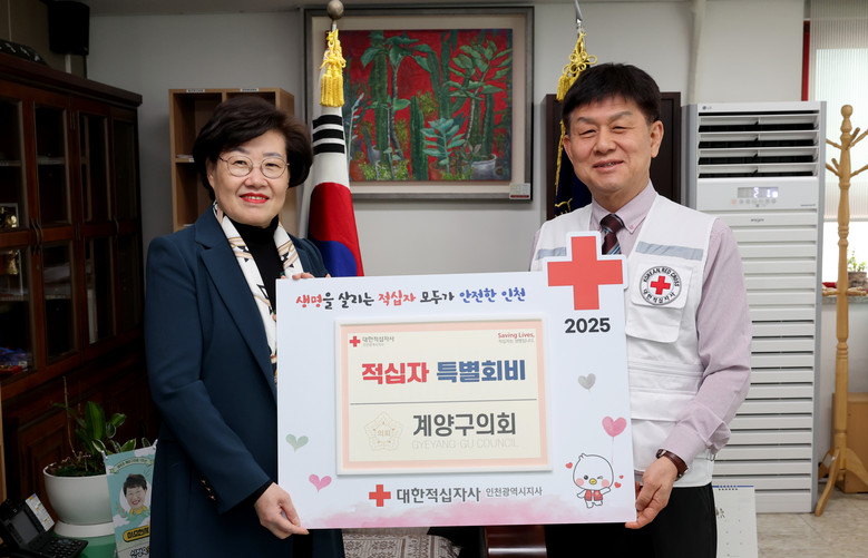 [계양구 세계타임즈=심하린 기자] 인천 계양구의회(의장 신정숙)는 20일 의장실에서 대한적십자사 인천지사 홍성조 사무처장과 대한적십자사봉사회 계양지구협의회(회장 이정숙) 등 관계 임원들이 참석한 가운데 2025년 적십자 특별회비를 전달했다.