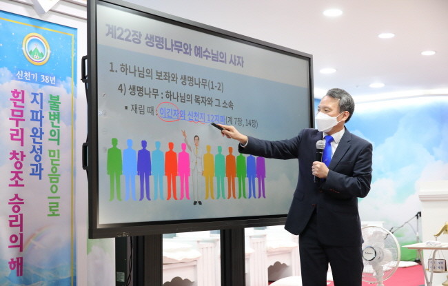 [세계타임즈 백진욱 기자] 신천지(총회장 이만희, 이하 신천지예수교 증거장막성전)가 ‘하나님의 새 언약 계시록 예언과 성취 증거’ 세미나를 통해 세계 최초 요한계시록의 말씀을 알리는 가운데, 유영주 서울야고보지파장이 23일 요한계시록의 마지막 장인 22장 강의에 나섰다.