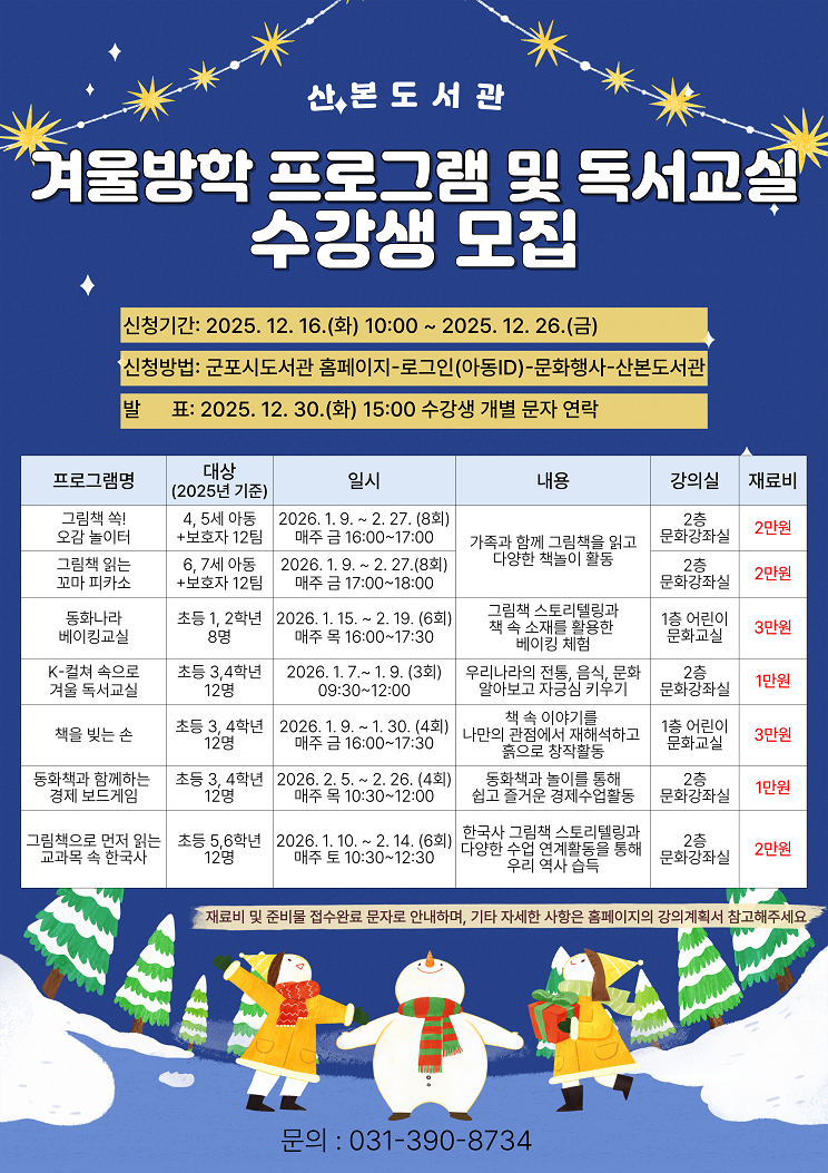 참가 신청은 2025년 12월 16일부터 12월 26일까지 군포시도서관 홈페이지에서 선착순으로 마감된다. 자세한 일정 및 내용은 군포시도서관 홈페이지 공지사항을 참고하거나 산본도서관팀 (031-390-8743)으로 문의하면 된다.