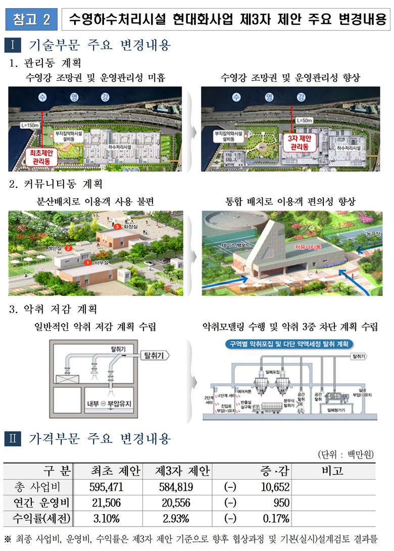 제3자 제안공고에 따라 제출된 사업제안서는 최초 제안대비 총사업비 약 100억 원이 감소돼 시 재정지원금 감소 효과는 물론, 악취 대책에 대해서는 처리장 경계지점의 법정기준보다 대폭 강화된 기준을 제시하여 상부 공간을 이용하는 경우에도 악취를 느낄 수 없는 수준으로 보완되었다.