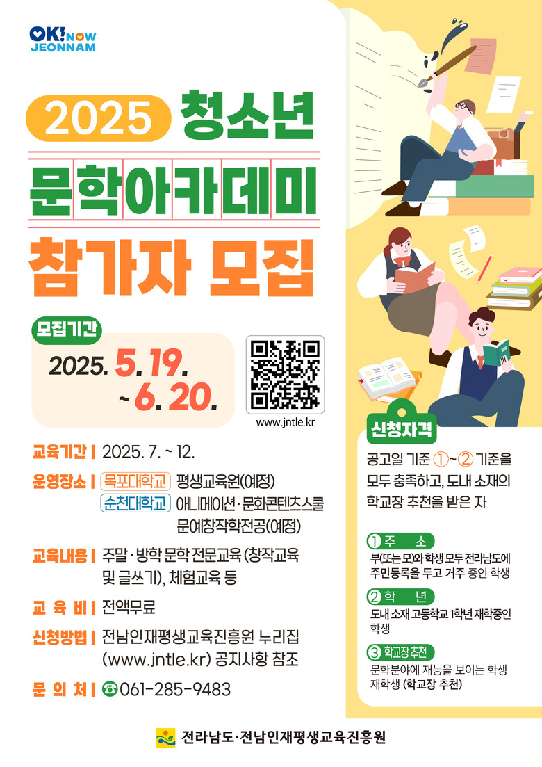 청소년 문학아카데미는 전문 문학교육과 체험활동이 연계된 창작 중심 교육 프로그램이다. 전남도의 ‘인재육성 고속도로’ 사업 일환이다. 청소년 개개인의 창의성과 문학적 감수성을 계발하고, 미래 문학 인재로 성장하도록 체계적으로 지원할 계획이다.