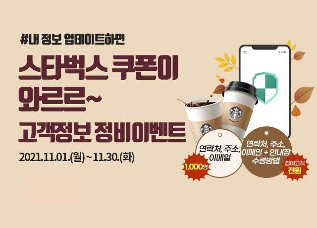 고객정보 업데이트만 한 고객에게는 1,000명 추첨을 통해 스타벅스 커피쿠폰을 드리며, 안내장 수령방법도 함께 변경한 고객에게는 전원 스타벅스 커피쿠폰을 증정한다.