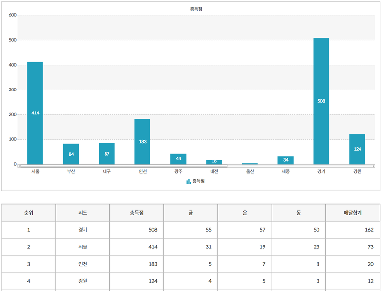 경기도의 뒤를 이어 ‘맞수’ 서울이 414점으로 종합 2위에 올랐고, 인천은 183점을 기록하며 3위에 이름을 올렸다.