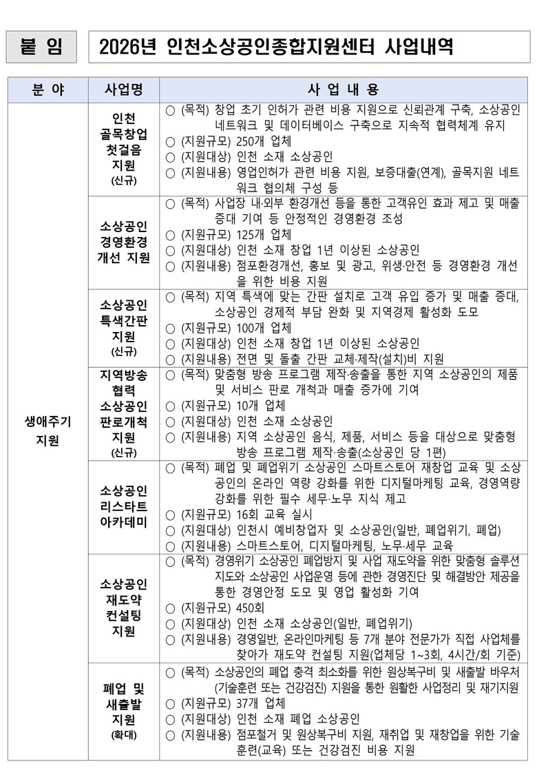 창업 초기 소상공인의 부담 완화를 위해 ‘인천 골목창업 첫걸음 지원사업’과 지역 특색을 반영한 ‘특색간판 지원사업’을 새롭게 도입한다. 이와 함께 점포 환경 및 위생·안전 개선을 지원하는 경영환경개선 사업과 지역방송과 연계한 판로개척 사업 등을 통해 매출 증대와 경쟁력 강화를 도모한다.