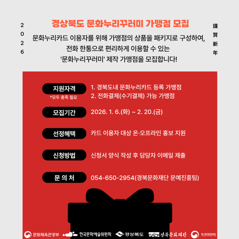 문화누리꾸러미 가맹점 모집 등 문화누리카드 관련 자세한 사항은 경북문화재단 홈페이지(www.gacf.kr) 및 카카오톡 채널 ‘경북문화재단 문화누리카드’에서 확인가능하며, 경북문화재단 문예진흥팀(054-650-2954)으로 문의하면 된다.