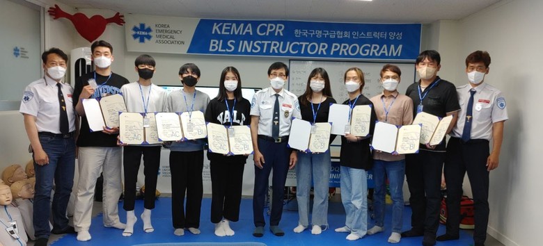 | ▲ 한국구명구급협회가 개최한 제55기 심폐소생술 전문강사양성과정에서 실기평가에 최종 합격한 8명과 함께 사진을 찍고있다 |