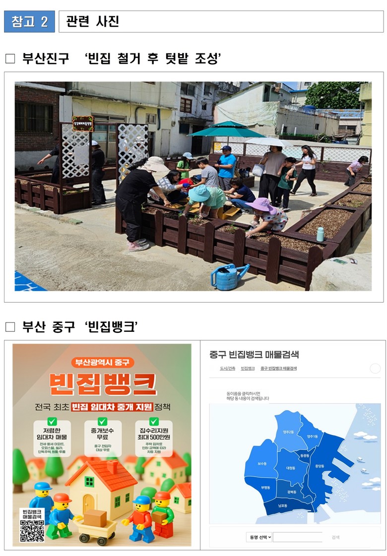 또한 부산진구는 관련 법령(「빈집 및 소규모주택 정비에 관한 특례법 시행령」) 개정에 앞서 2023년 12월 조례를 개정해 무허가 빈집을 정비할 근거를 선제적으로 마련했다. 이를 통해 철거 부지를 주민의 ‘마을 텃밭’으로 조성하는 등 행정의 창의성과 주민 체감도를 동시에 높인 행정을 추진했다.