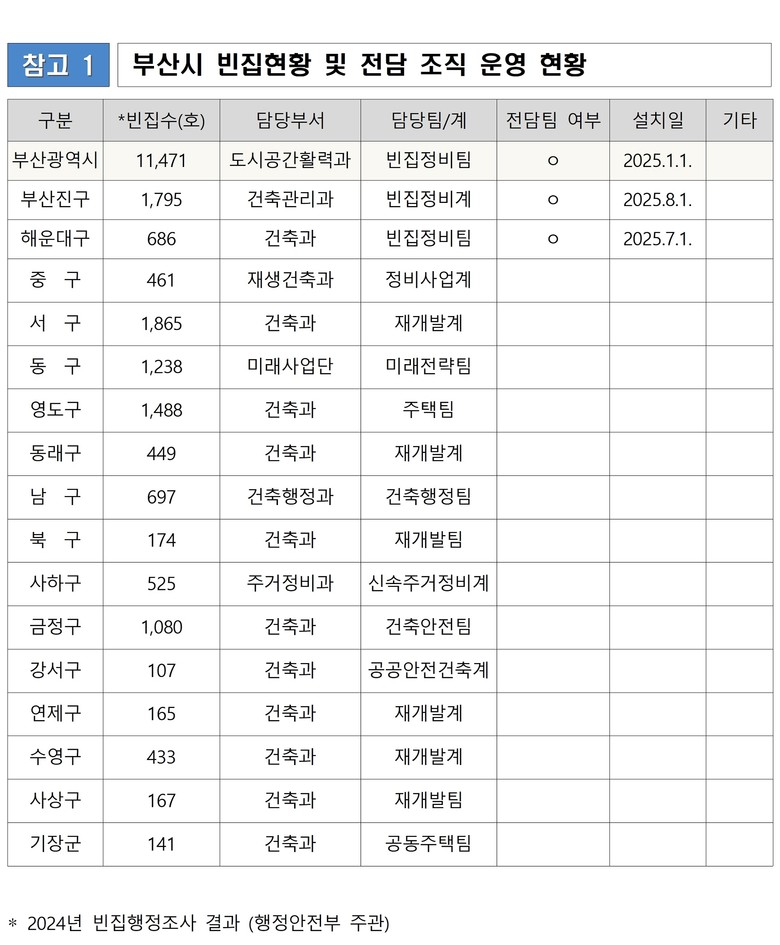 지난 1월 빈집전담팀을 신설한 시의 시책에 맞춰 부산진구는 8월 1일 자로 '빈집정비계'를 신설해 전담 조직의 전문성을 확보하고 빈집 정비 업무를 선도적으로 추진했다.