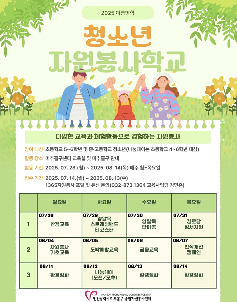 청소년 자원봉사 입문 교육을 기본으로, 도박 예방 교육, 금융교육, 환경교육, 인식 개선 캠페인, 경로당 정서 지원 활동, 양말목 스트레칭 밴드 만들기 등 다양한 주제의 활동이 진행될 예정이다.
