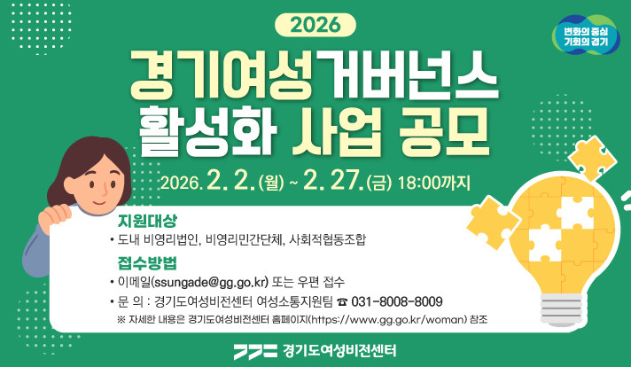○ 여성 주도 공공 과제 발굴, 지역 내 협력으로 개선 [경기도 세계타임즈=송민수 기자] 경기도여성비전센터가 오는 2월 27일까지 경기여성거버넌스 활성화 공모사업 수행 단체를 모집한다.
