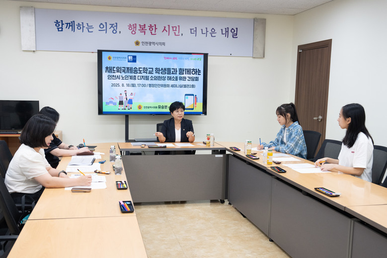 유승분 의원은 지난 18일 인천시의회 행정안전위원회 세미나실에서 채드윅국제학교 송도캠퍼스 (12학년) 김지안·변규리 양과 (재)인천인재평생교육진흥원 이주희 평생교육부장 및 김명랑 정책연구실장 등이 참석한 가운데 ‘채드윅국제송도학교 학생들과 함께하는 인천시 노인계층 디지털 소외현상 해소를 위한 간담회’를 개최했다.