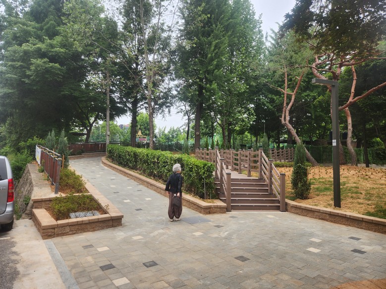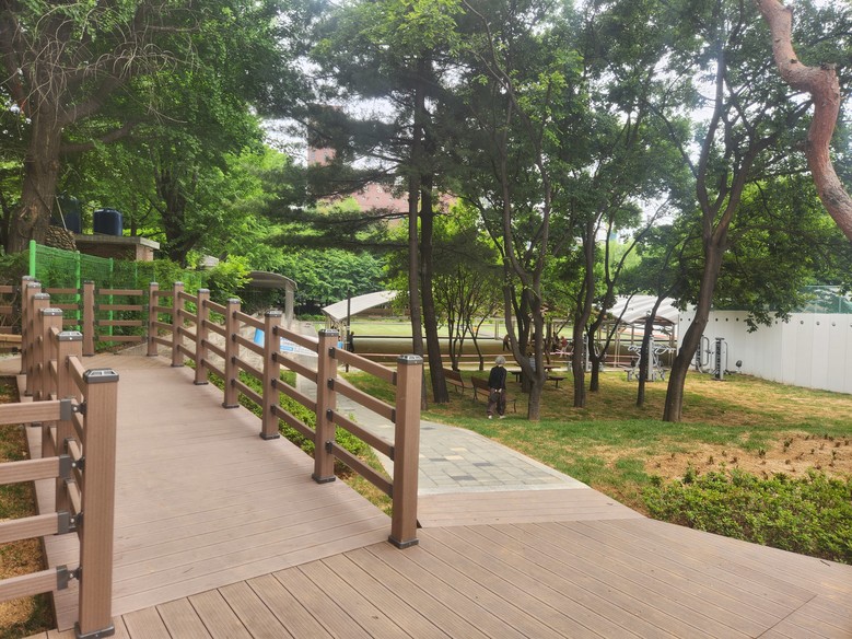 구는 녹지공간의 다양한 활용을 위해 노후 펜스와 잡목을 제거한 뒤 기존 큰나무들 아래 그늘 쉼터와 열린 잔디 공간을 조성했으며, 물놀이장과의 접근성을 위해 연결데크를 설치했다.