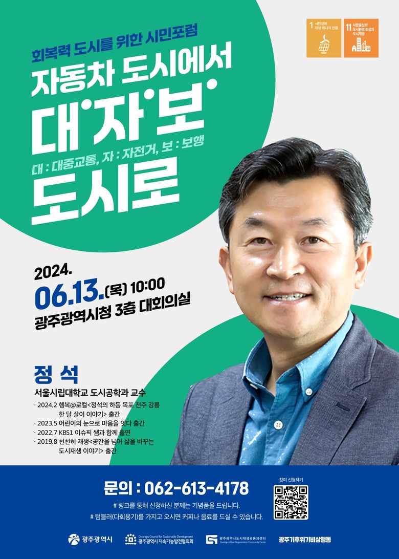 광주광역시(시장 강기정)는 오는 13일 오전 10시 시청 대회의실에서 도시재생·도시설계 석학 정석 교수(서울시립대 도시공학과)를 초빙해 ‘회복력 도시를 위한 시민포럼 자동차 도시에서 대·자·보(대중교통·자전거·보행) 도시로’를 주제로 특별강연을 개최한다.