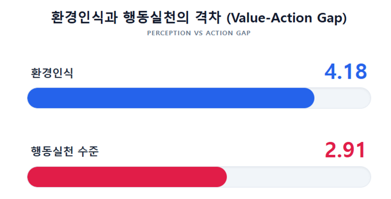 반면 행동 실천 수준은 참가자 전체 평균 2.91점에 그쳐 인식과 행동 간 격차가 발생하는, 이른바 ‘가치-행동 괴리(Value-Action Gap) 현상’이 확인됐다.