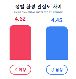 경기환경에너지진흥원이 주관한 2025년 시민환경교육 프로그램 참여자 424명을 대상으로 환경 인식과 행동 간 관계를 분석한 결과, 도민의 환경 문제 관심도는 5점 만점에 4.25점, 가치 수준은 4.10점으로 나타났다. 성별 응답에서는 여성의 환경 관심도가 4.62점으로 남성 4.45점보다 높았다.