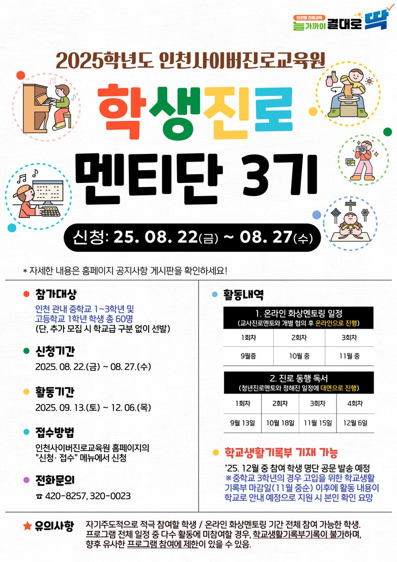 인천시교육청 관계자는 “이번 프로그램이 학생들에게 다양한 진로 경험을 제공하고, 스스로 진로를 탐색할 수 있는 자신감을 높이는 계기가 되길 바란다”며 “앞으로도 학생들의 성장을 돕는 진로 지원 프로그램을 지속해서 운영하겠다”고 말했다.